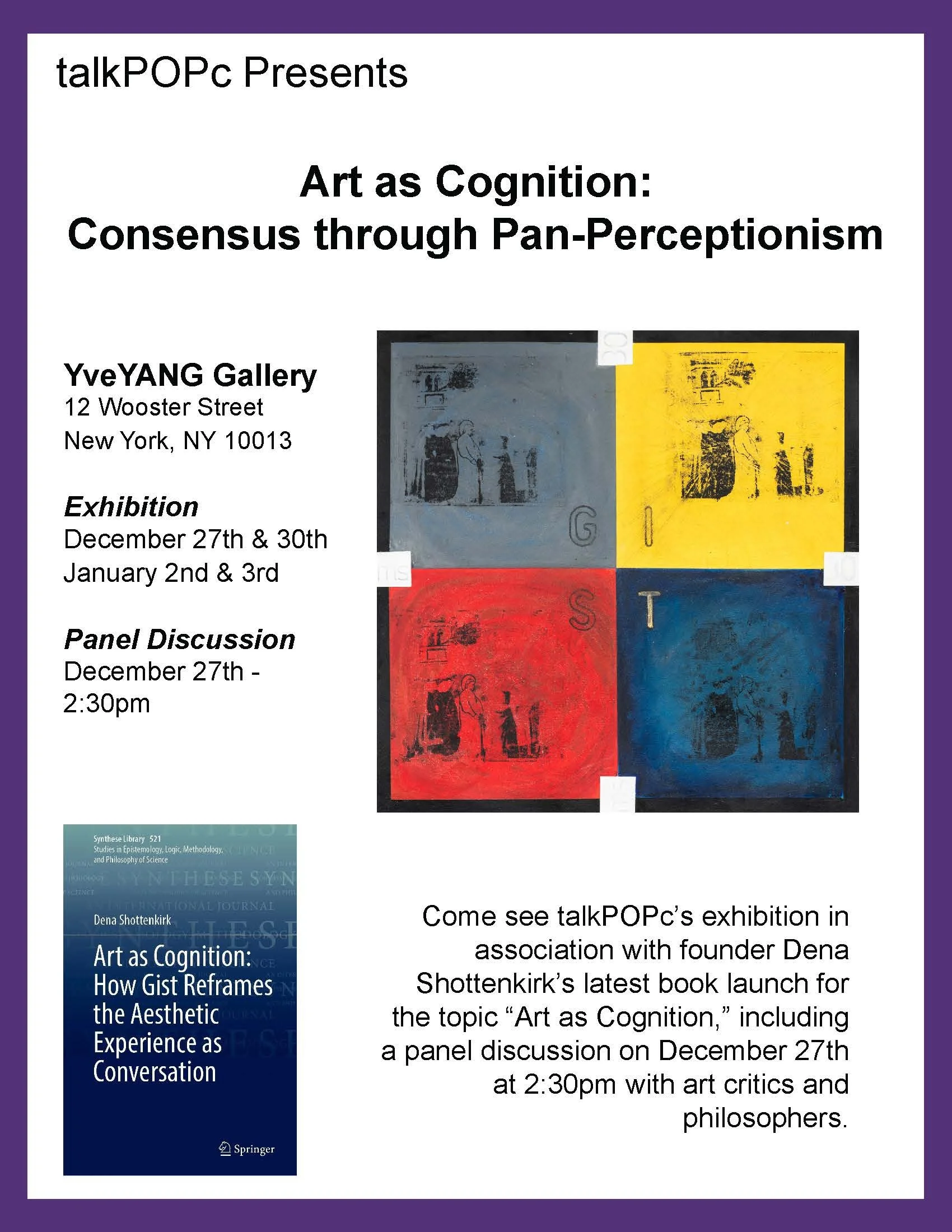 Come see talkPOPc’s exhibition at YveYANG Gallery (12 Wooster Street New York, NY 10013) in association with founder Dena Shottenkirk’s latest book launch for the topic “Art as Cognition,” including a panel discussion on December 27th at 2:30pm with art critics and philosophers.
