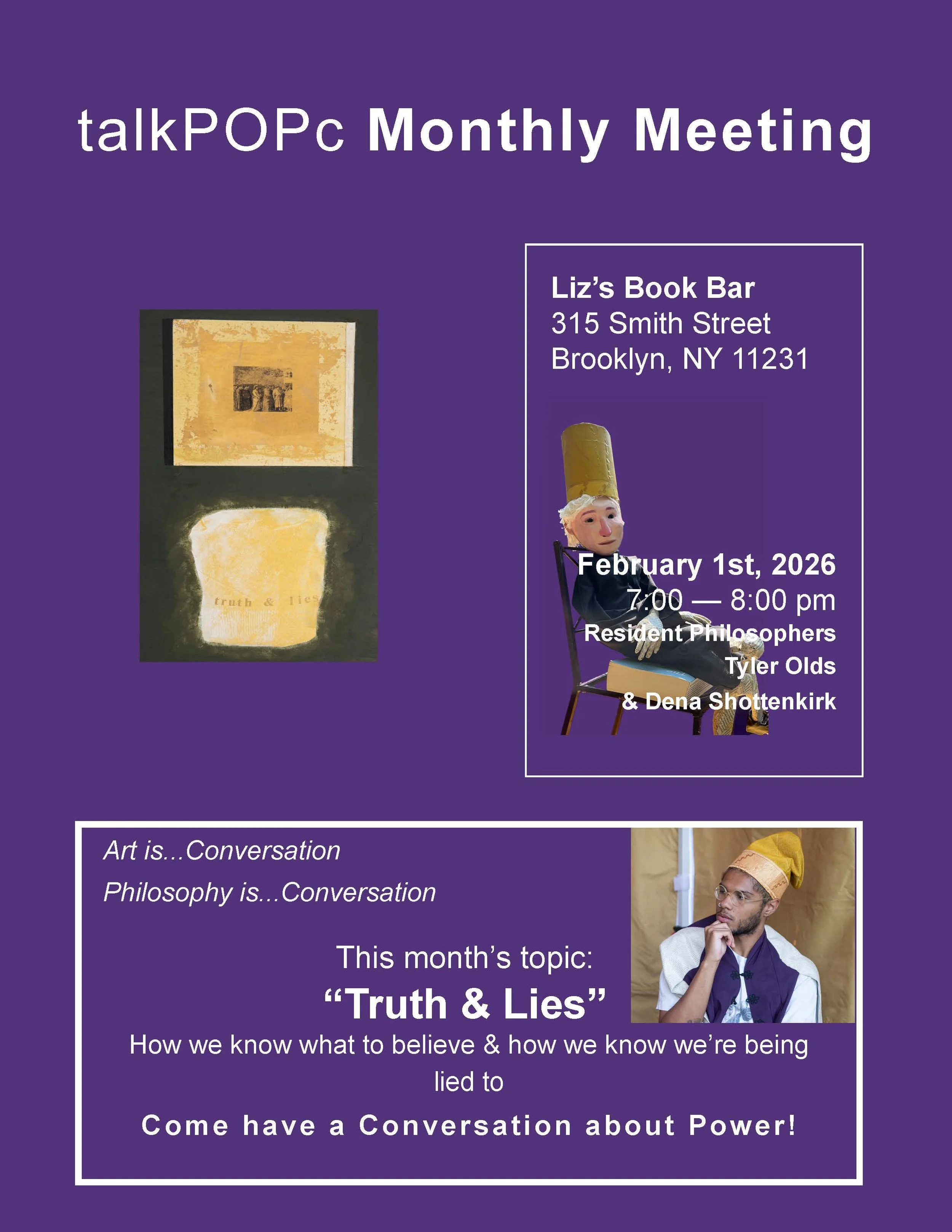 The goal of these monthly meetings is to ignite conversations around talkPOPc’s topics and reignite conversations that were started at previous talkPOPc happenings (which are posted on our podcast). This conversation event will be on the current topic “Power” and will run by Resident Philosophers Tyler Olds and Dena Shottenkirk at Liz’s Book Bar (315 Smith Street Brooklyn, NY 11231), February 1st 7:00pm-8:00pm.